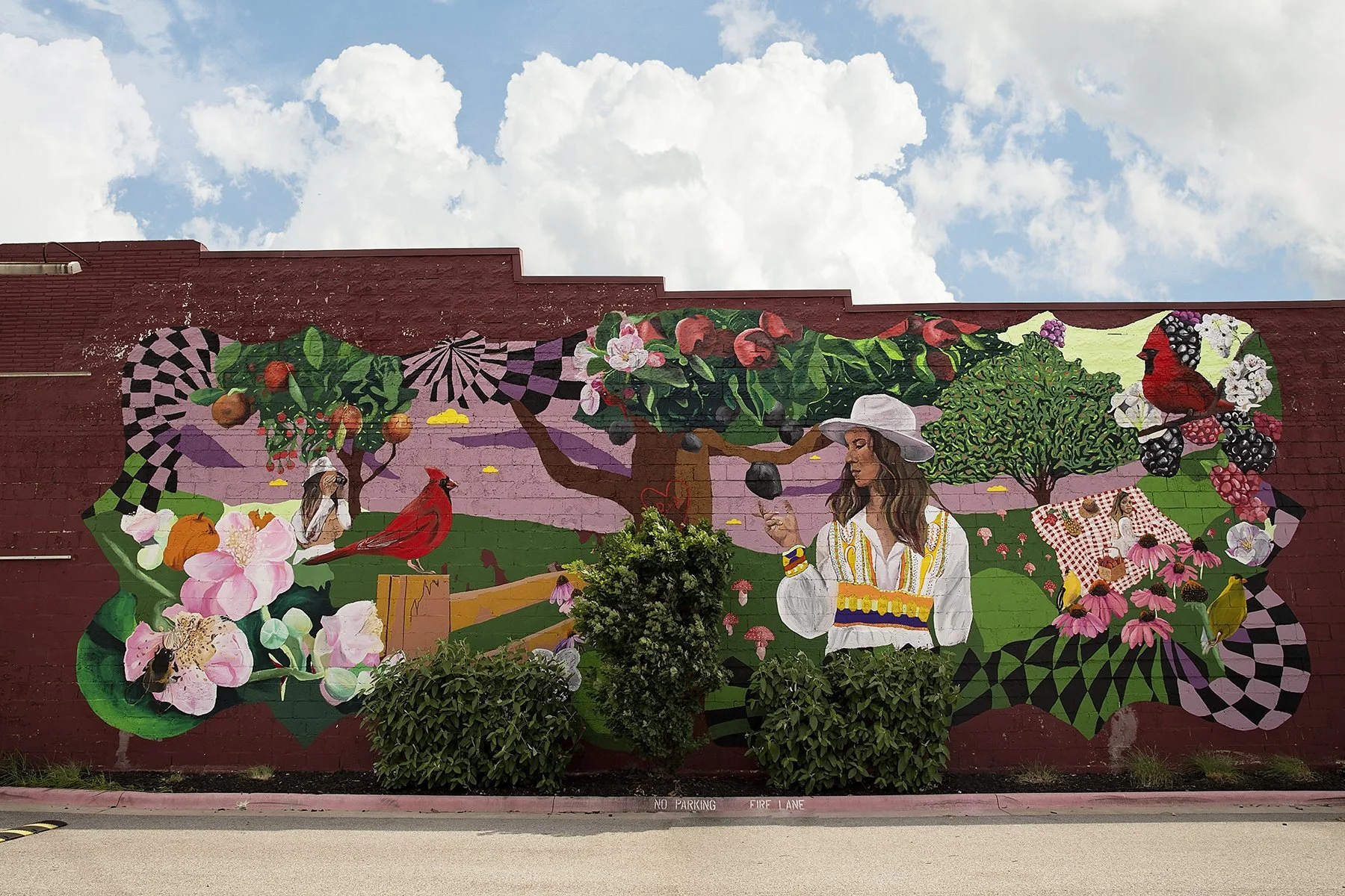 The woman who serenely moves throughout the mural inspires the viewer to reflect on individual and collective pasts alongside the present and future.Erickson’s emphasis on location invites an internal exploration of all the places we inhabit, both real and imagined. Like our central figure, we create and move throughout our own narratives of memory, history, and place. How often do we pause to watch, harvest, and enjoy the delights of these places?